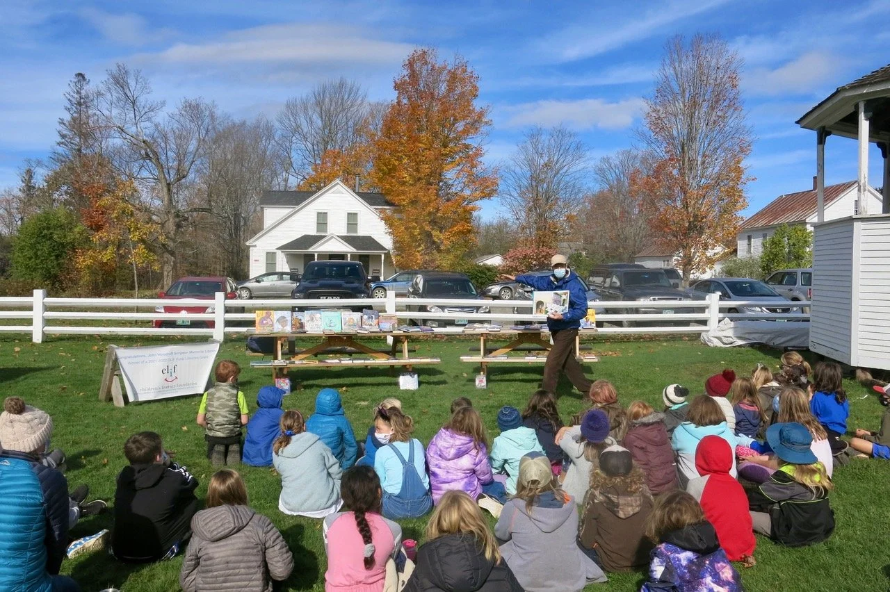 October 27, 2021: Duncan McDougall of Children’s Literacy Foundation tells a story to Craftsbury Academy students as part of our Rural Libraries Grant